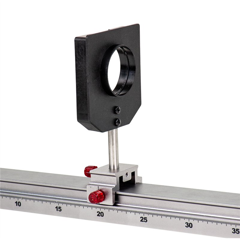 very stable holder with mounting ring for optical components in mounts and slide and aperture holders can be attached; the lens holder can be fixed in a rider on the optical bench using a fixed stem